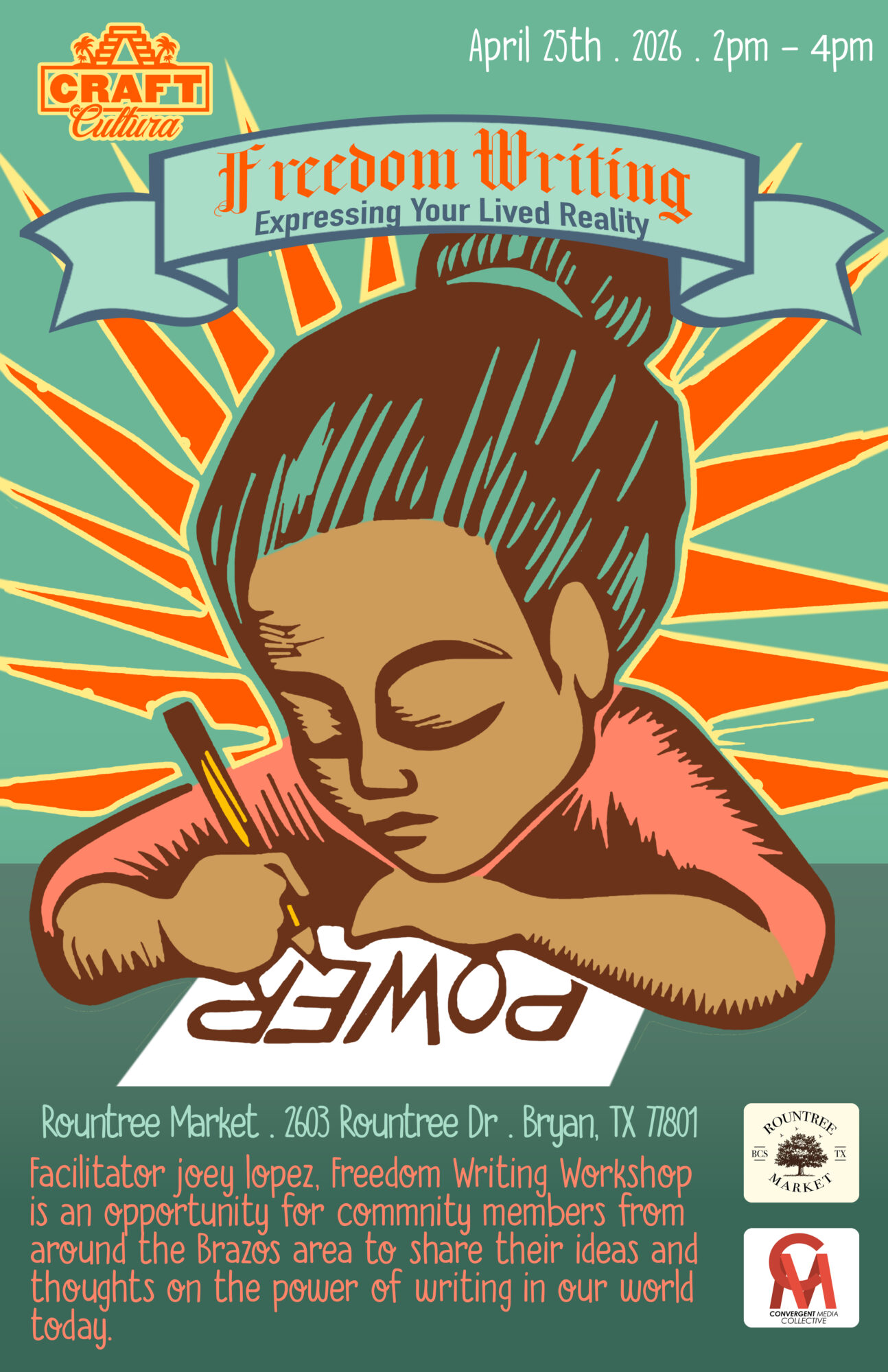 Join us for a Freedom Writing Workshop, in collaboration with Rountree Market, Craft Cultura and Facilitator joey lopez, Freedom Writing Workshop is an opportunity for artists from around the Brazos area to come together in a platica writing format to share their ideas and thoughts.